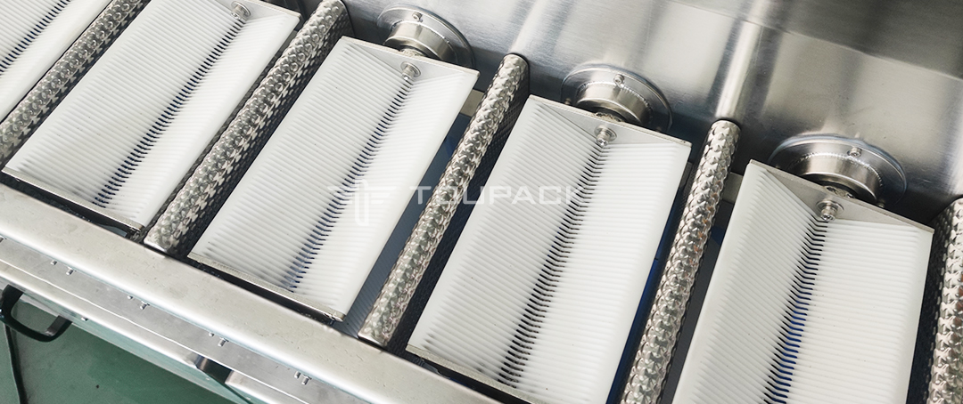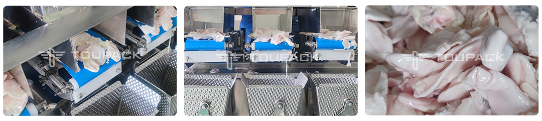 对于生鲜、水产行业中,单个体积大、形状不规则,且不适合用传统型腔式斗门开合结构料斗计量的鱿鱼、毛肚、生鱼片等粘黏性物料,七头直列翻转式组合秤给出了专属解决方案。它的工作方式极具巧思:每个称重料斗对应下层 2 个记忆斗,当称重料斗完成取值后,会通过左、右翻转的方式,分别将物料投放到对应的记忆斗内,随后下层共 14 个记忆斗共同参与组合,精准得出目标重量值。组合完成后的物料,会被投放到下层的集料输送线,平稳输送至后续工位,整个流程连贯高效,无需人工过多干预。