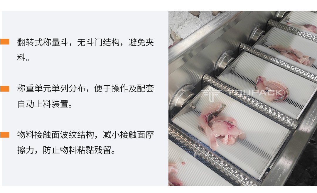 在生鲜行业的水产类包装环节,称重计量往往是影响效率与品质的关键一环。不少生鲜水产行业都曾面临这样的困境:面对鱼泡、鱼翅这类不规则且流动性差的黏性物料,传统称重设备难以精准计量,易导致分量偏差;处理鱿鱼、毛肚、生鱼片等单个体积大、形状不规则的物料时,传统型腔式斗门开合结构的料斗更是频频 “掉链子”,要么出现物料粘黏残留,要么计量偏差大,不仅拖慢生产节奏,还可能造成物料浪费,增加企业运营成本。